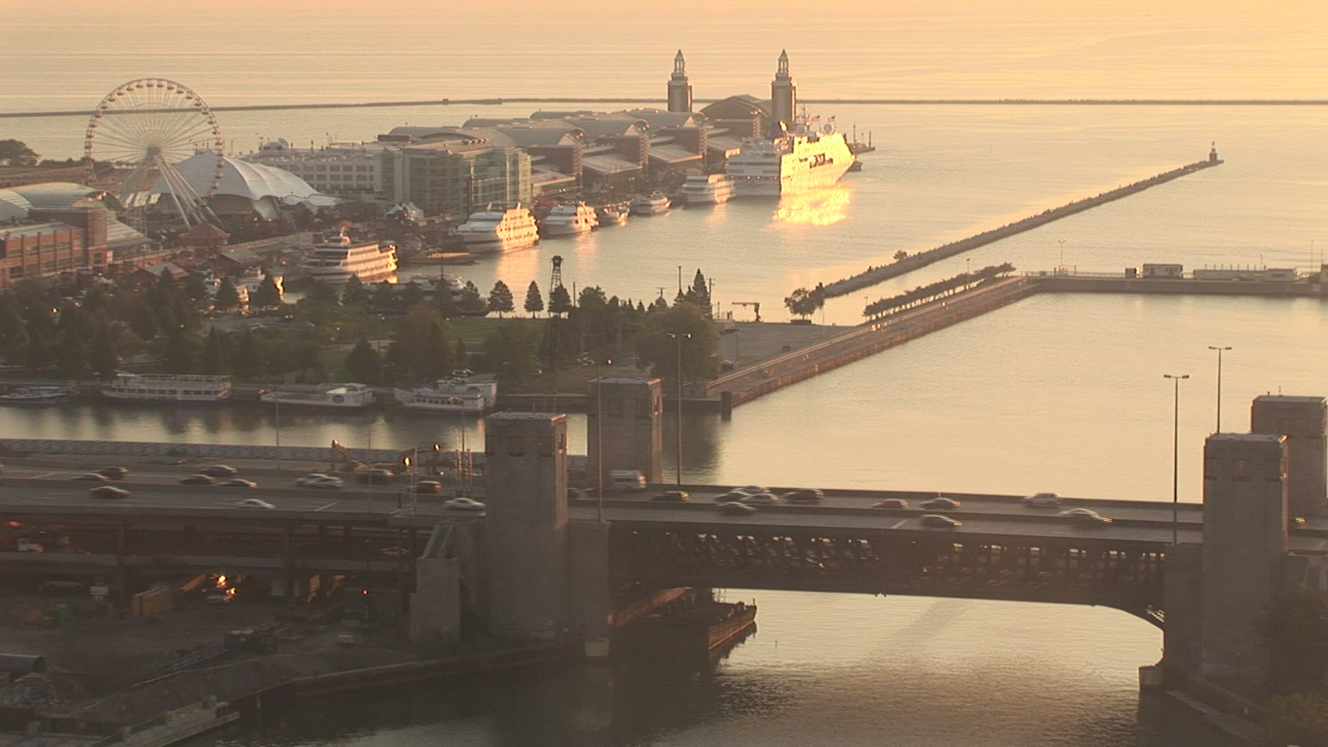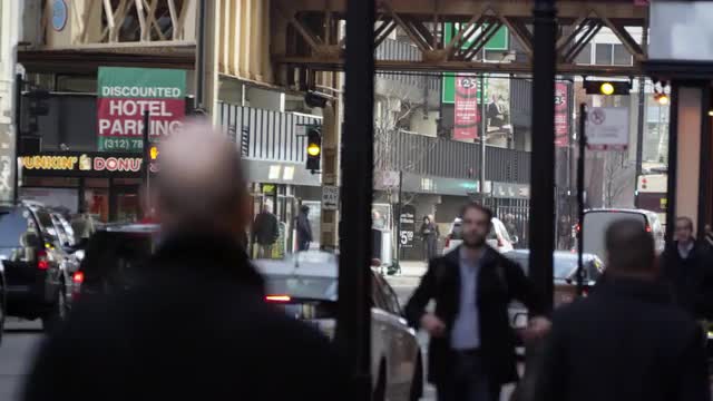 Chicago pedestrians and traffic downtown. Faces blurred.