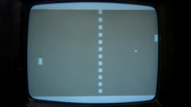 > Tight shot of a retro TV screen with Pong being played on the screen.