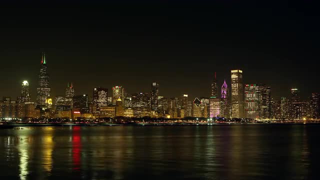> Night timelapse of Chicago from across the water.