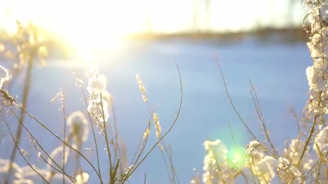 Snowdrifts With Dried Grass on Snowy Field at Sunset Close-Up View