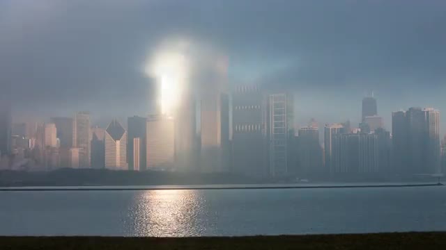 > Time lapse of fog blowing over Chicago from across the water.