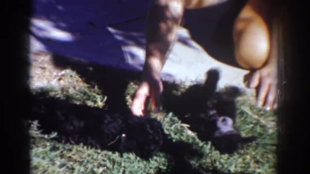 654591 - 1962: two black puppies lying on grass someone playing teasing cute fluffy YORBA LINDA CALIFORNIA