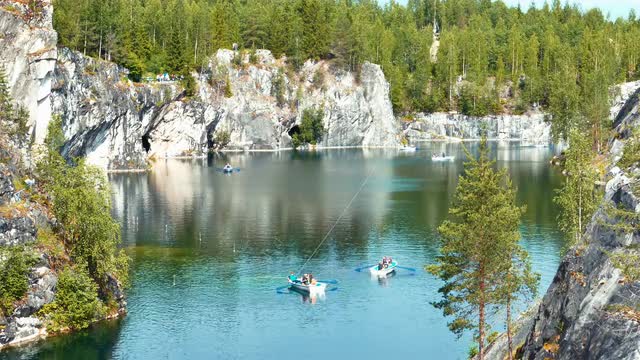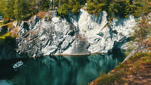 Ruskeala/russia - Jul 08 2015: Ruskeala, Russia - July 2, 2015: People on Boat Swimming at Marble Canyon Ruskeala in Karelia, Russia. Ruskeala is One of Nature Wonders and Popular Ecological Tourism Sight in Karelia, Russia