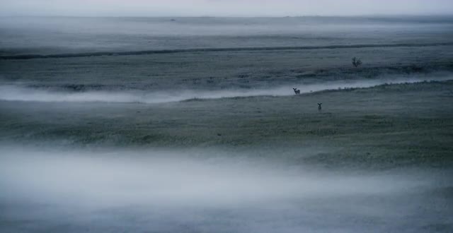 > A deer running across fog covered grassy field