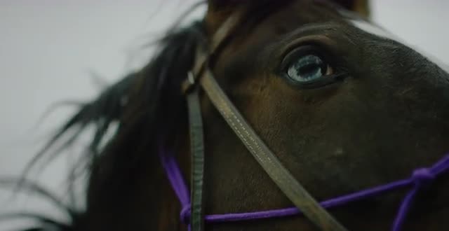 > Close up shot of horse face and eye