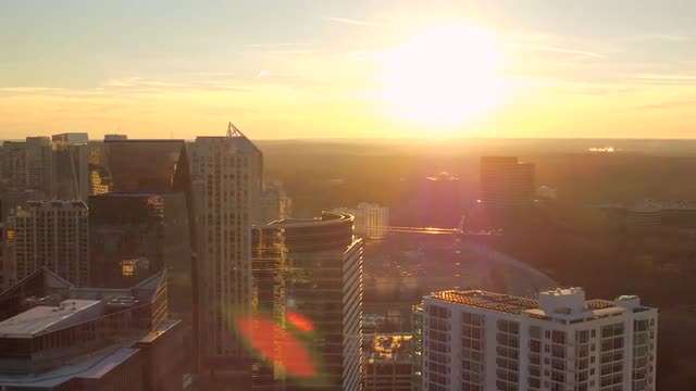 v192 Flying low over Buckhead downtown panning with cityscape sunset views.