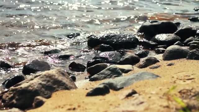 Water Splashes to the Stones at the Lake Shore, Low Angle Closeup 4k Ultra hd Shot