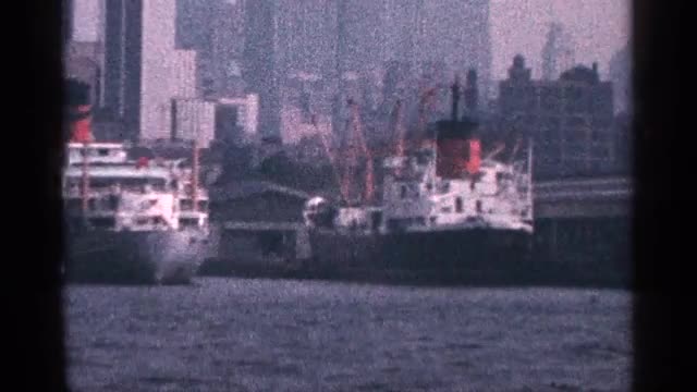 723684 - 1964: the board move in the slow time in harbor another side stop ship back side big building sky vi