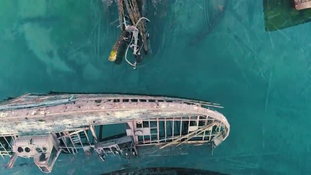 723683 - 1964: the board slow run time view near to big ship stop the harbor near water back side building hu