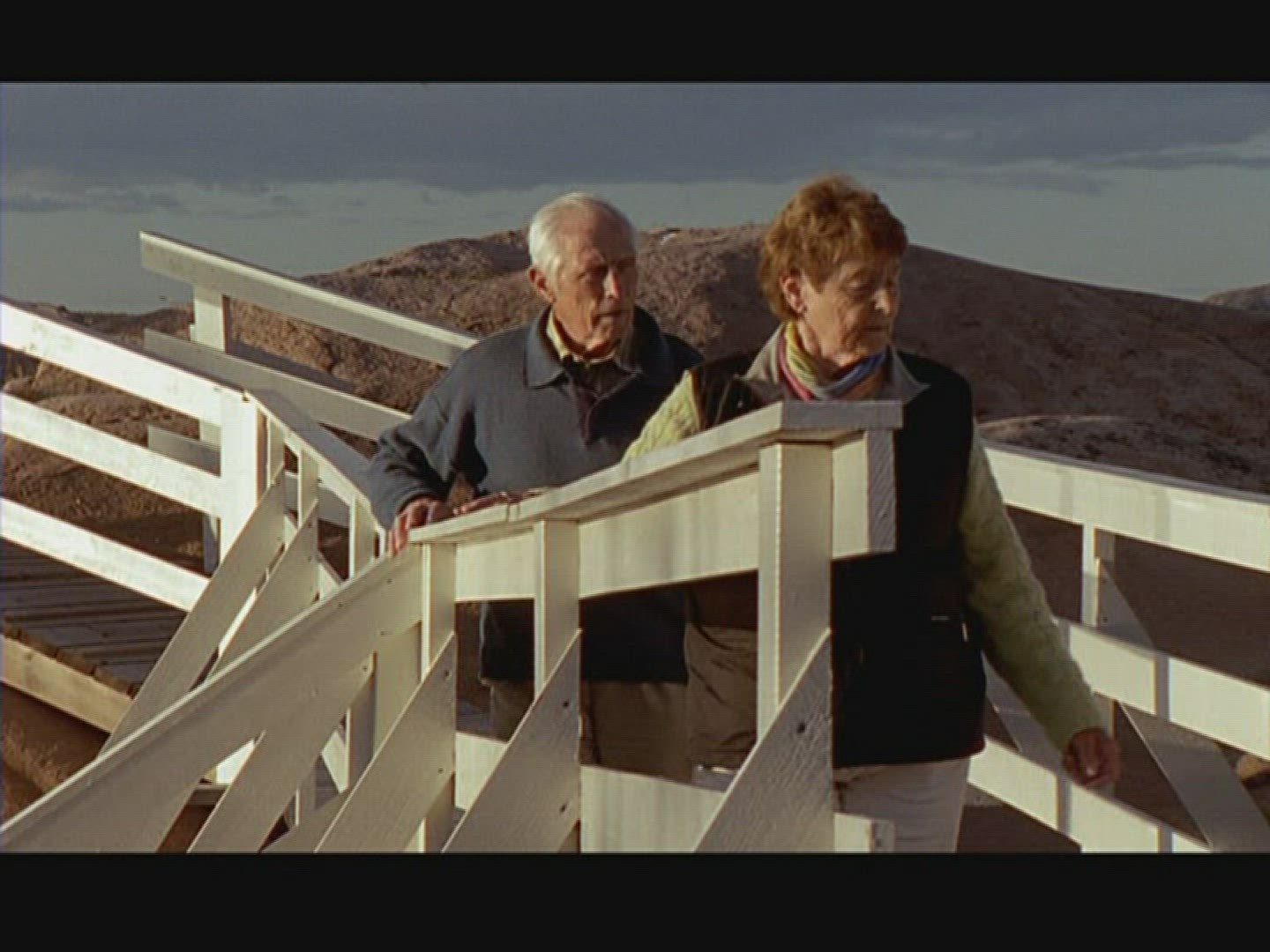 > 1959: Old married couple rocking porch swing chair no smiles allowed.
