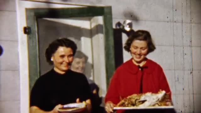 > 1959: Proud happy women leftover turkey and pie serving trays.