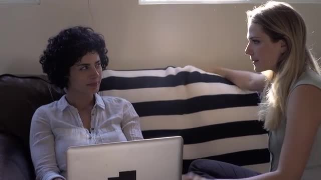 > Lesbian couple using laptop on sofa