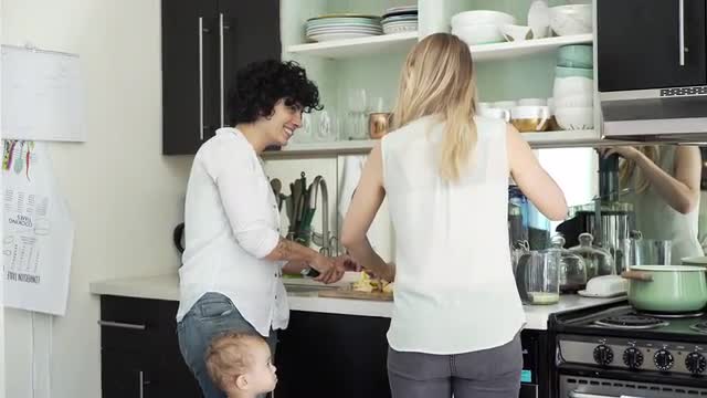 > Lesbian couple talking in backyard