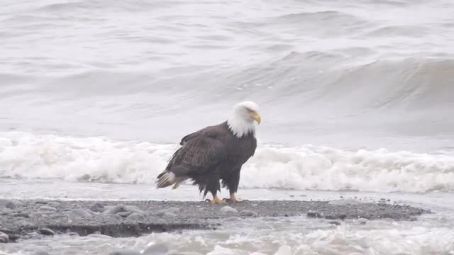 176094 - Bald Eagle on beach by steam with ocean backdrop