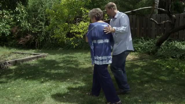 > Elderly woman walking with man in backyard. Man catches her when she stumbles.