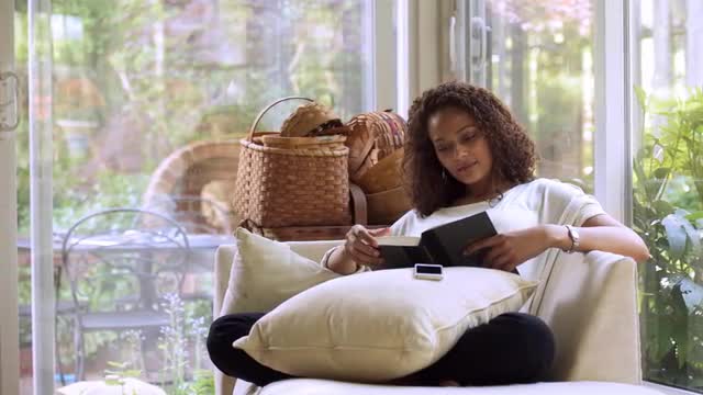 780275 - African American woman reading book near window