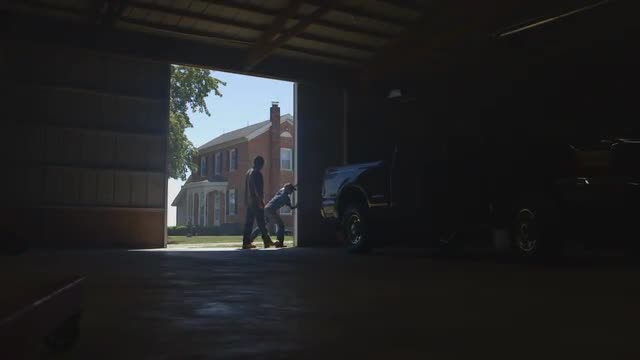 531273 - Caucasian father and son sweeping silo floor