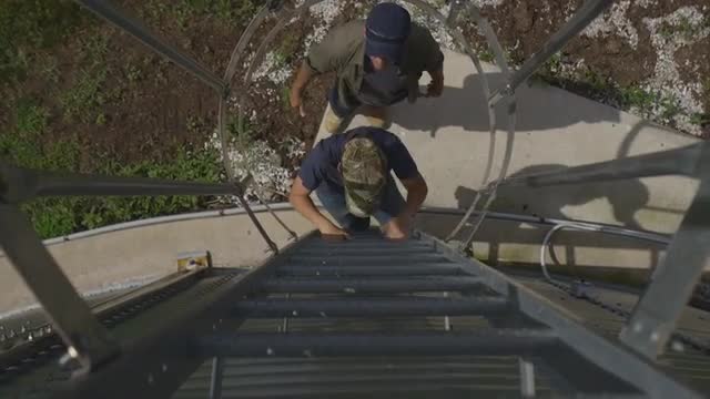 531296 - Caucasian father and son climbing silo