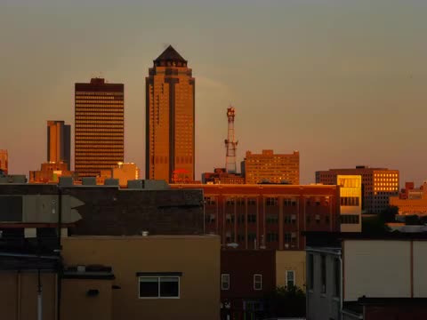 Sunrise over downtown Des Moines skyline with shadows moving across the buildings.
