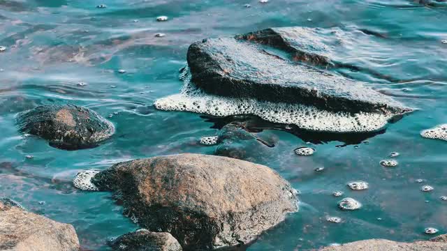 Water Splashes to Stones on the Lake Shore, 4k Ultra hd Low Angle Shot