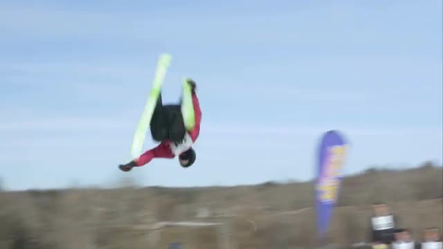 > Skier does 360 rodeo flip off jump
