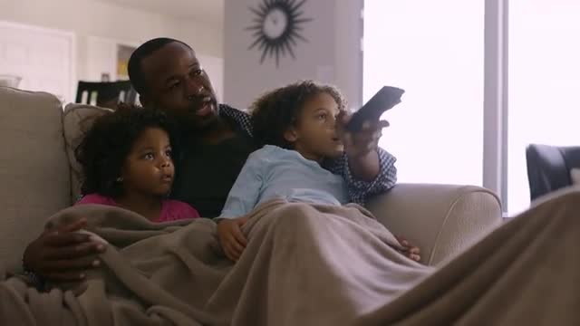 > Father and daughters watching television on sofa