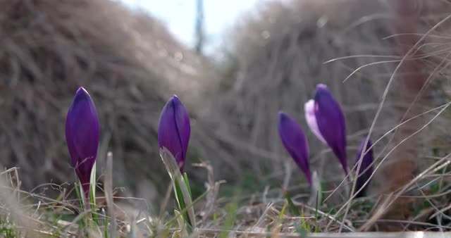 Spring Purple Crocus in Grass With Morning Light