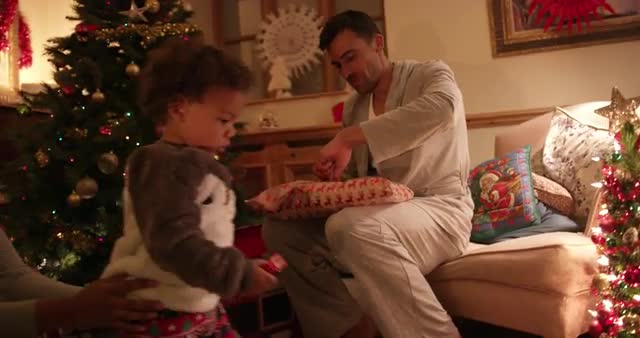 > Father reading to daughter on sofa