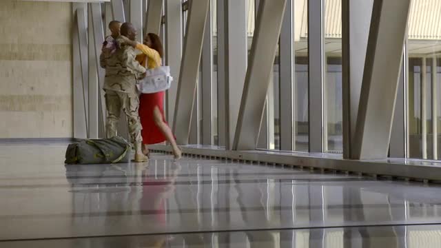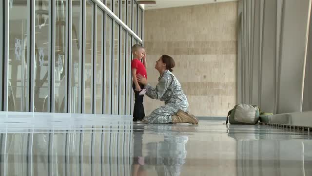 > African American soldier and son walking in airport