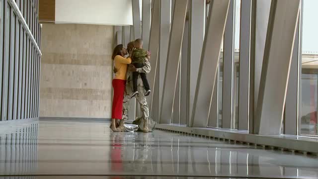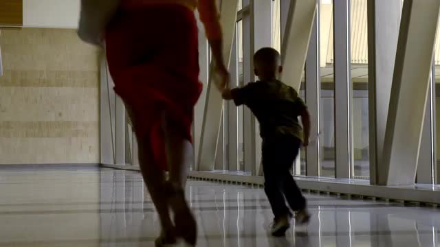 African American soldier and son walking in airport