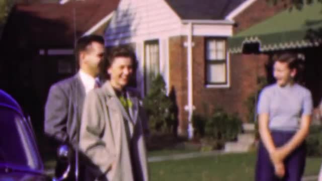 > 1964: Married couple meeting neighbors outdoor suburban home.