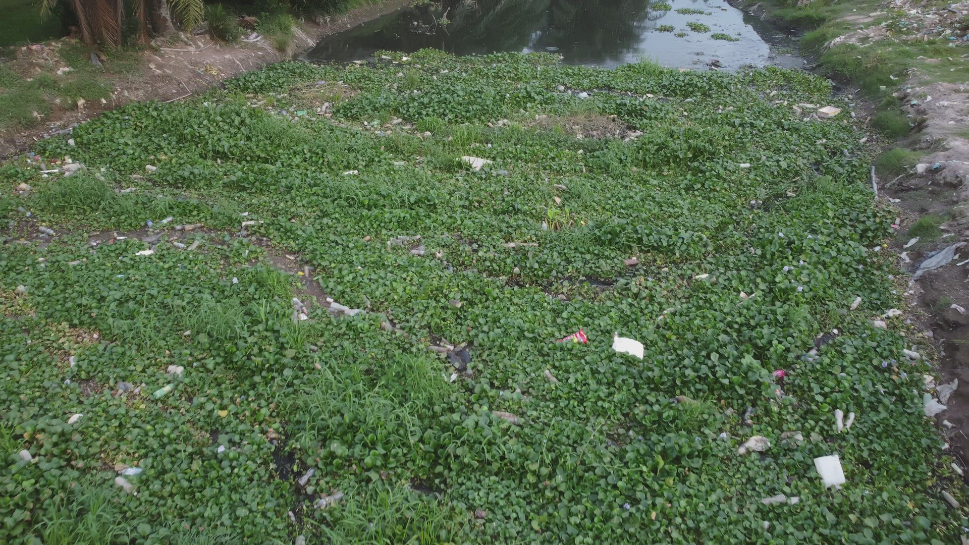 182683 - Garbage floats in a waterway full of algae.
