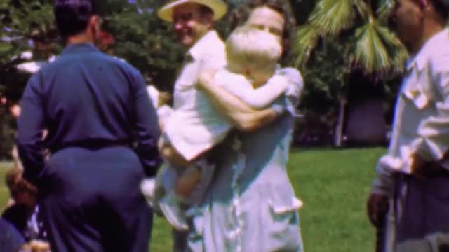 > 1957: Family outdoor park gathering mother holds blonde child.
