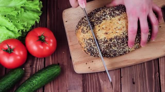 536213 - Cook Cut Bread With a Knife on a Board. on the Table Lay the Tomatoes, Lettuce and Cucumbers. the Re