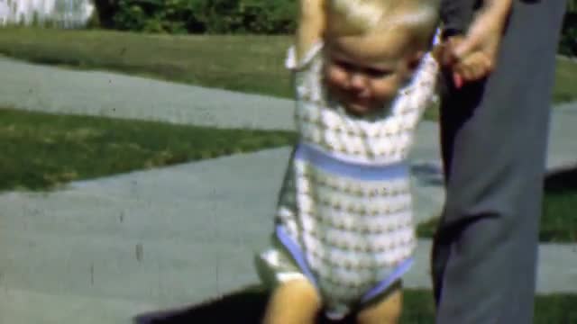 > 1958: Dad helps baby boy learn walk front yard suburban sidewalk.