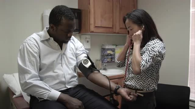 > Woman Measures Pressure. She Presses a Finger on the Tonometer.