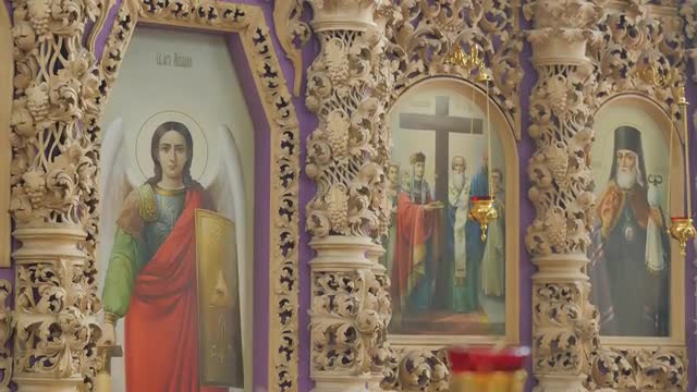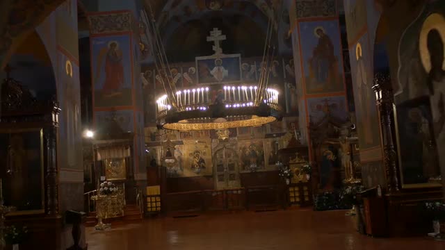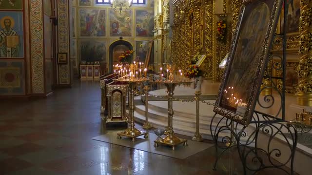 557593 - Arch Candelabrum Trinity Cathedral Paul of Thebes Holy Dormition Pochaiv Lavra Burning Candles in a