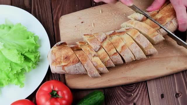 > Chef Cuts the Cucumber on the Board. on the Table Lay the Tomatoes and Lettuce. Top View.