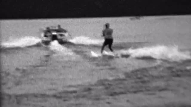 > 1962: Waterski man pulled behind speedboat dark mysterious lake.