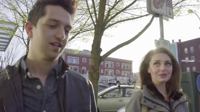 Cute couple walk and talk as the travel through a sunny downtown on a date