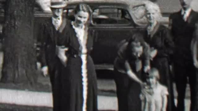 1939: Family together front yard windy day neighborhood city home.