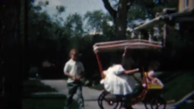 > 1957: Family baby cart red sled wheels pushing happy baby stroller.