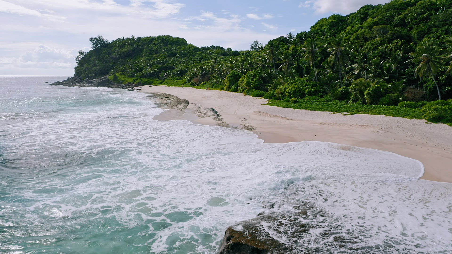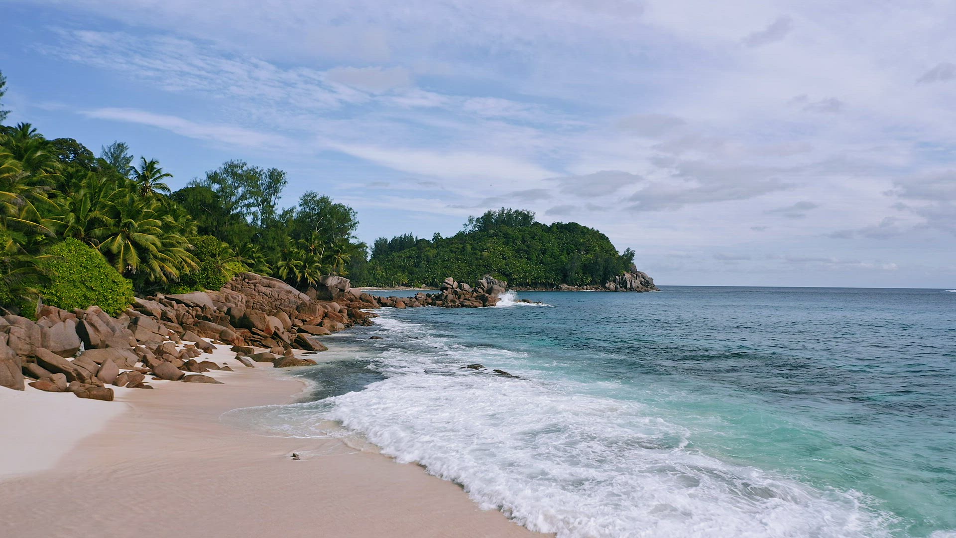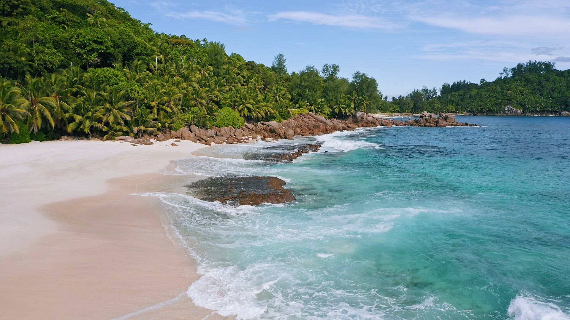 Aerial view of Grand Anse beach with white sand and azure water on La Digue Island, Seychelles