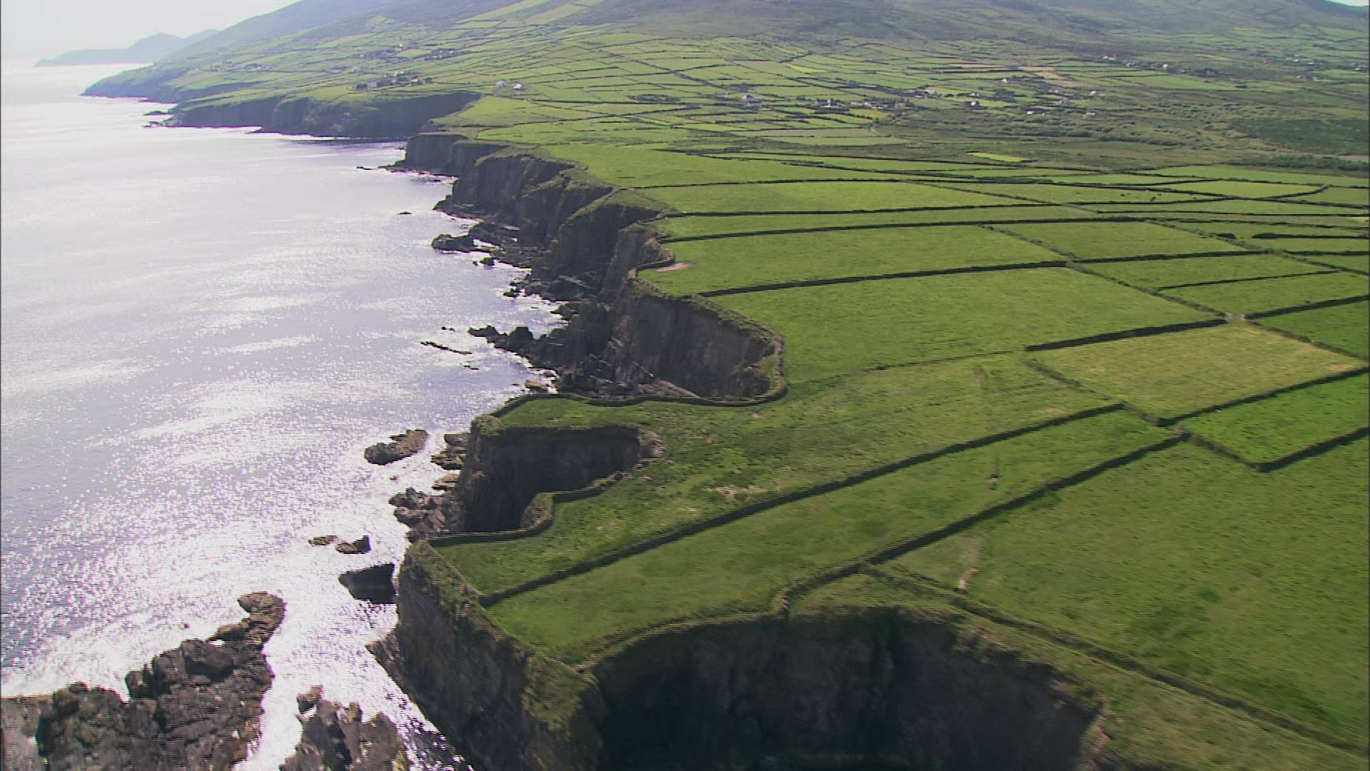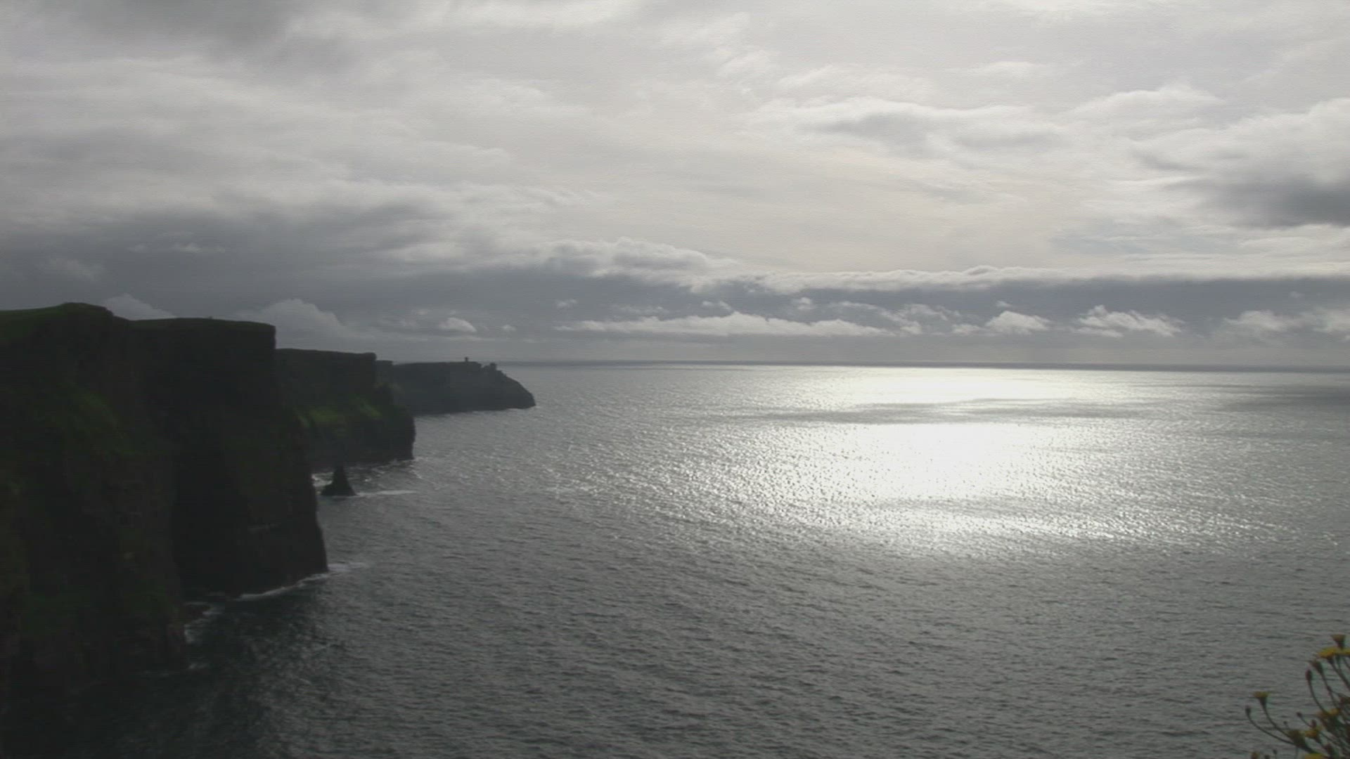 Calm waves break on the Cliffs of Moher in Ireland on a beautiful sunny day.