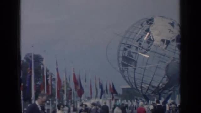1964: Unisphere globe closeup people crowd EXPO New York World's Fair.