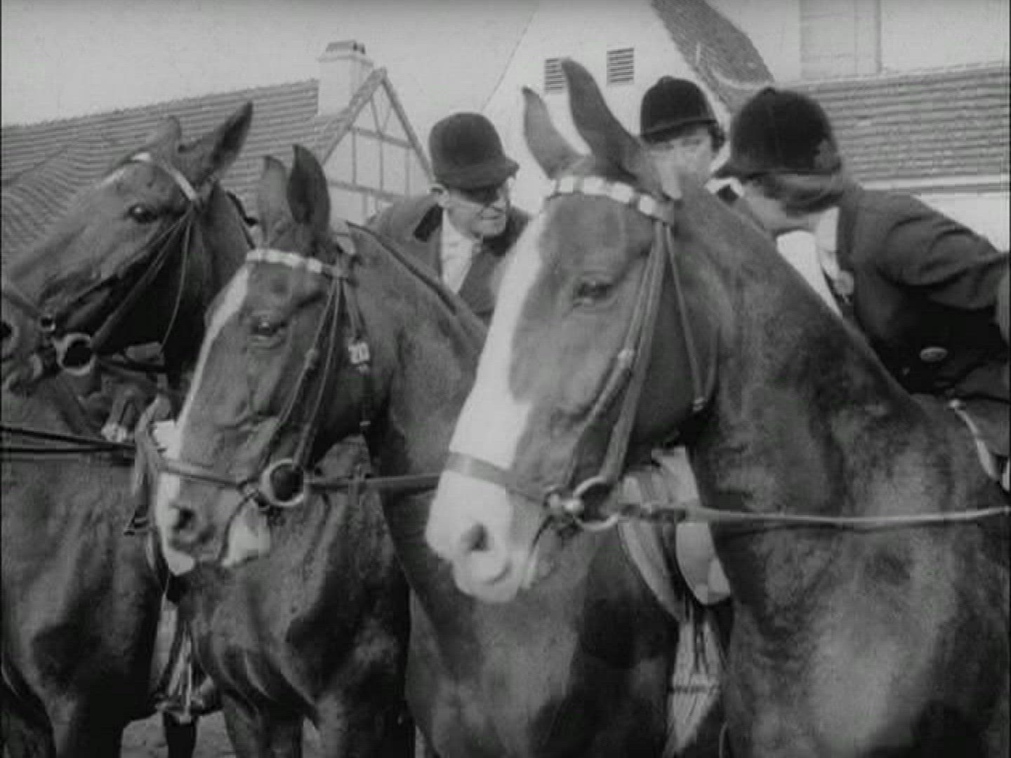 1958: Horse riding fox hunt pack dogs follow red jacket killers.