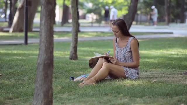 > Attractive Japanese young woman reading a book in a city park in Autumn
