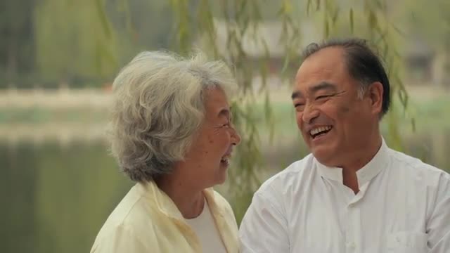 694072 - MS Portrait of elderly couple talking and smiling together outdoors / China
