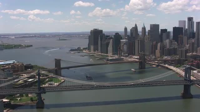 999795 - New York City, New York circa-2017, Flying over Manhattan and Brooklyn Bridges. Shot with Cineflex