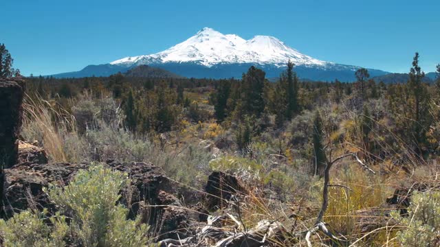 Slow dolly across a lush but volcanic landscape with Mount Shasta in the distance from Plutos Cave.